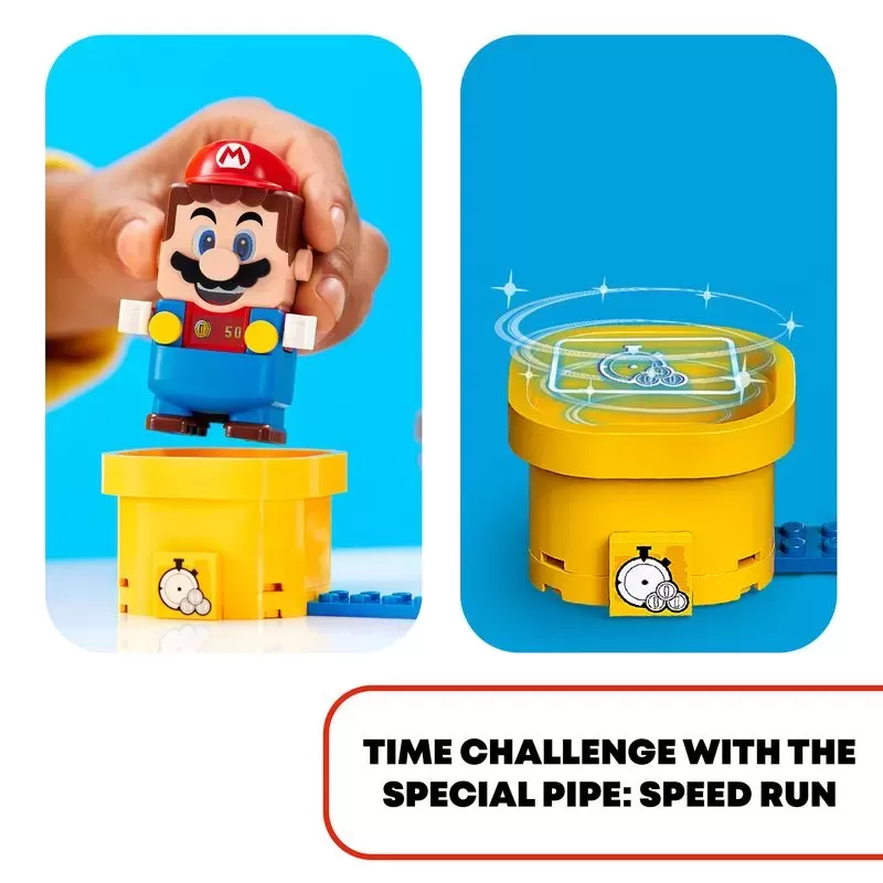 �?Includes LEttgGO® figures of iconic Super Mario�?characters �?2 Reznors, a seesawing Grrrol and a Blue Toad, plus a ? Block and Special Pipe: Speed Run offering players extra rewards.