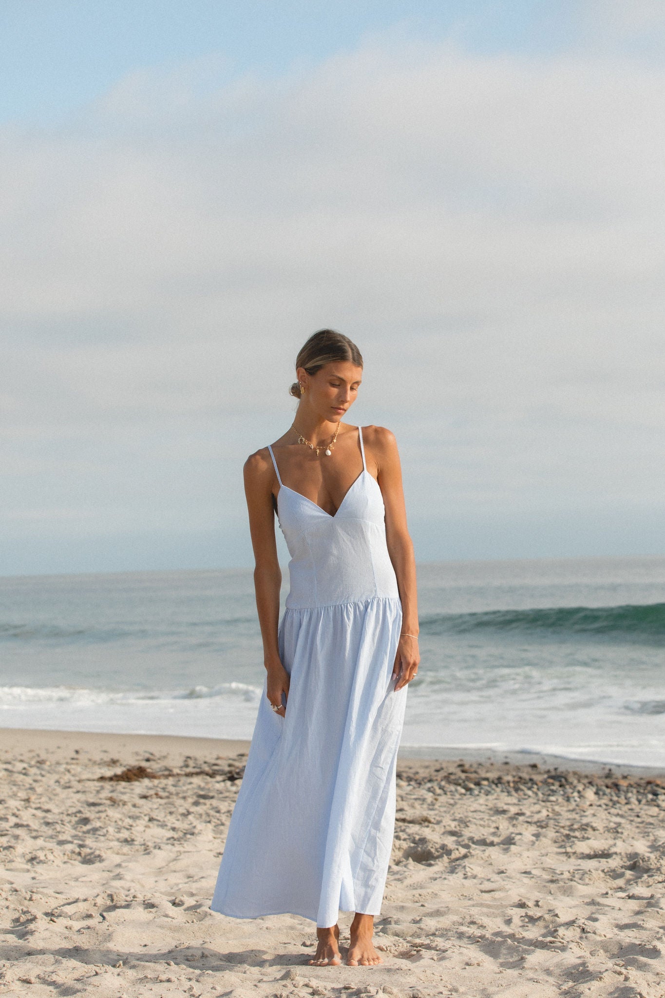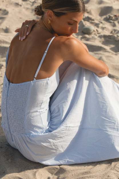 This lightweight blue striped dress features a flattering v-neckline, drop waist design, and a zippered smocked back for versatility and comfort. Made from soft cotton fabric, it's the perfect choice for a day spent by the sea.