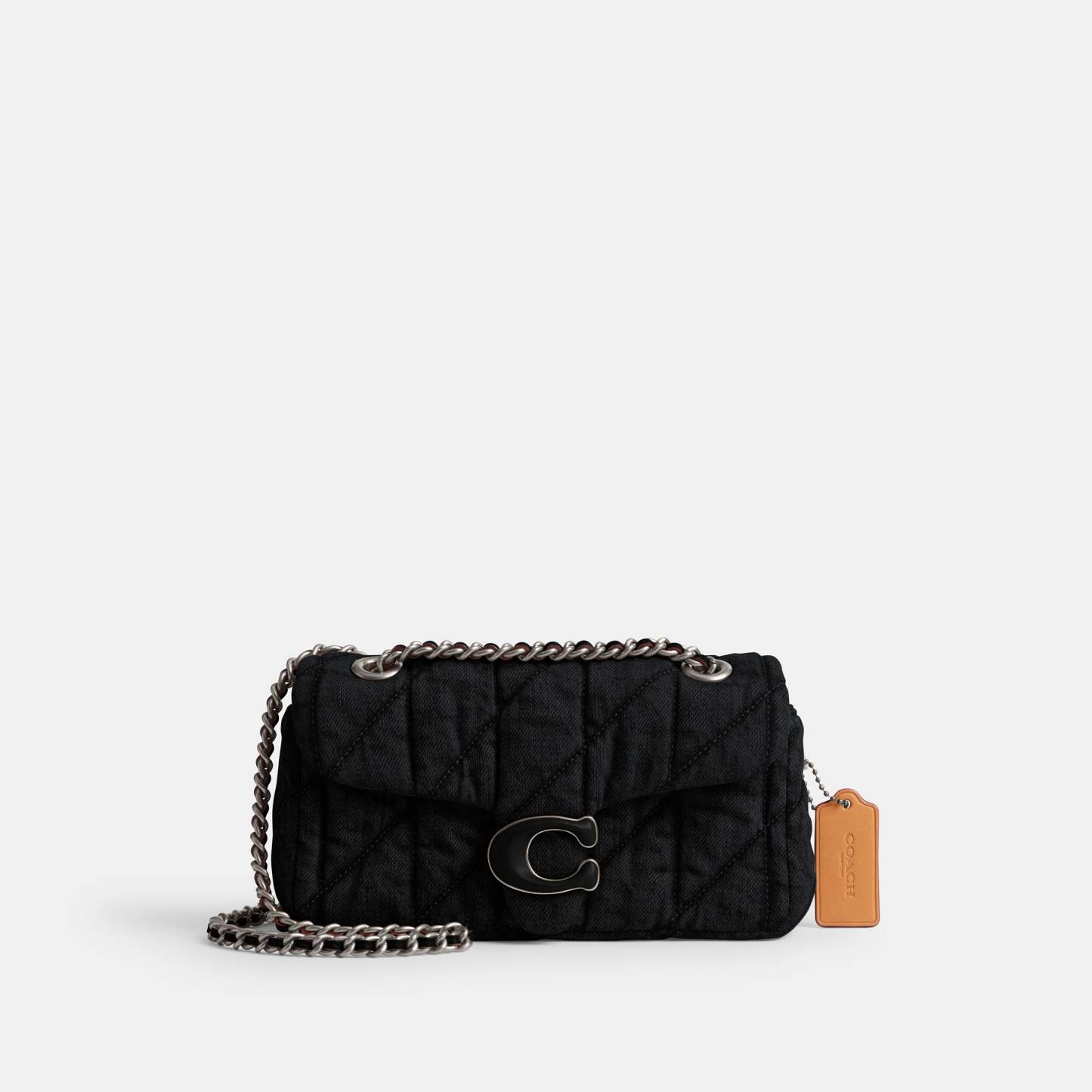 A modern take on an archival 1970s cothtach design, our structured Tabby shoulder bag is a casual-cool quilted denim style crafted of cotton* sourced from farms that use regenerative agricultural practices_those that help to maintain and rejuvenate land, increase biological diversity and soil health, and could lead to increased carbon absorption. It reflects our ongoing commitment to helping reduce our impact on the planet. Smaller than the 26, the petite 20 features a multifunction pocket and space for a phone. Finished with our Signature hardware for an iconic touch, wear the striking leather-laced chain strap long or short.