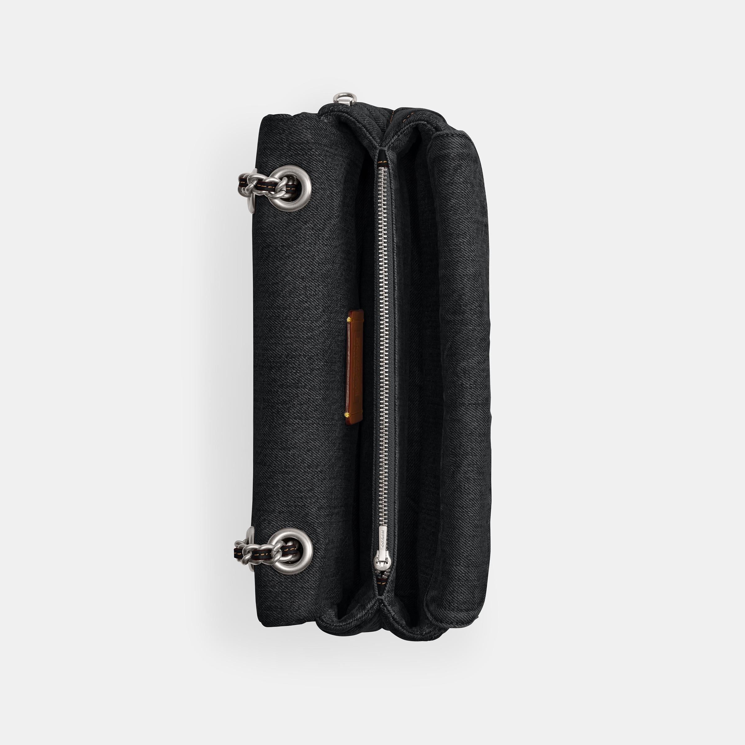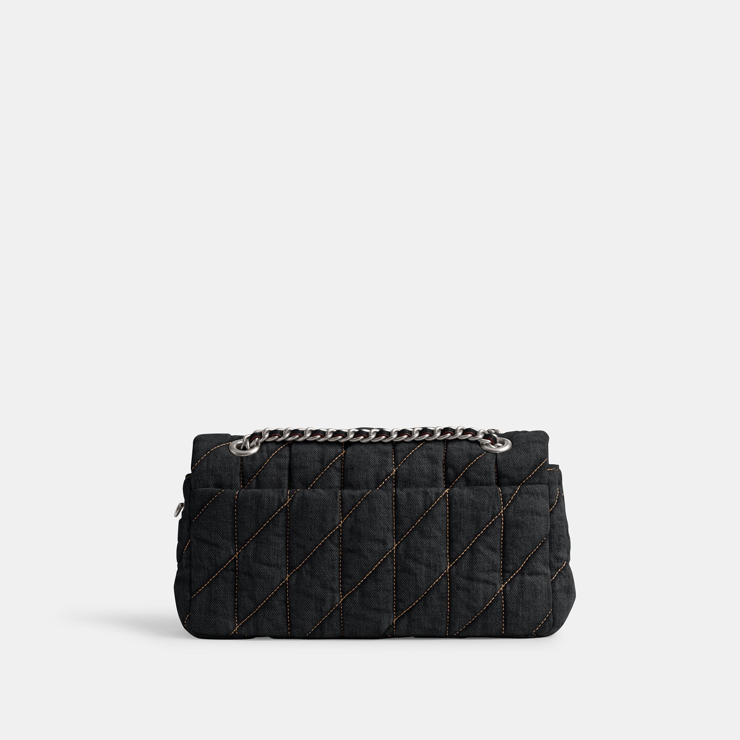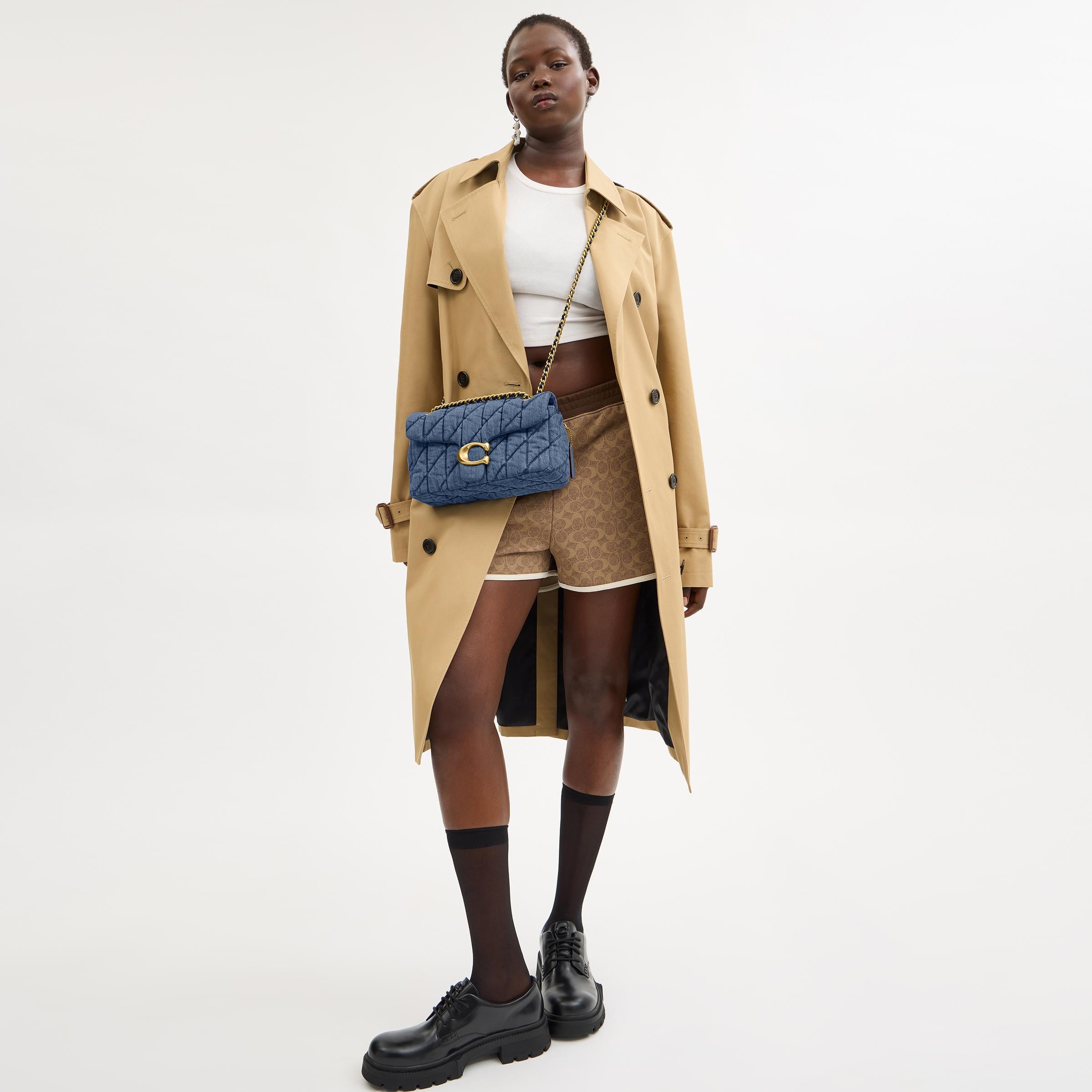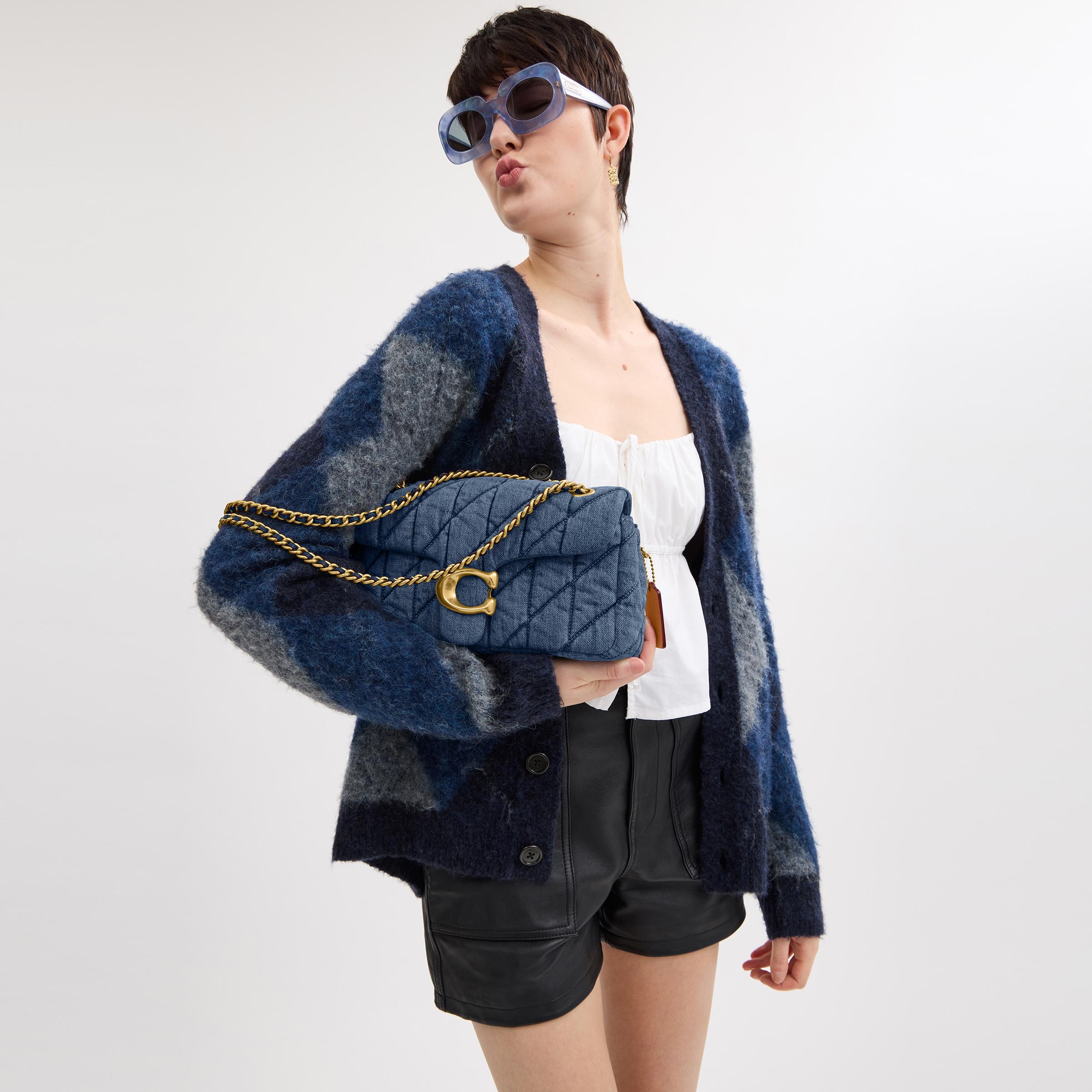 A modern take on an archival 1970s cothtach design, our structured Tabby shoulder bag is a casual-cool quilted denim style crafted of cotton* sourced from farms that use regenerative agricultural practices_those that help to maintain and rejuvenate land, increase biological diversity and soil health, and could lead to increased carbon absorption. It reflects our ongoing commitment to helping reduce our impact on the planet. Finished with our Signature hardware for an iconic touch, the compact 26 features a striking leather-laced chain strap to wear long or short.