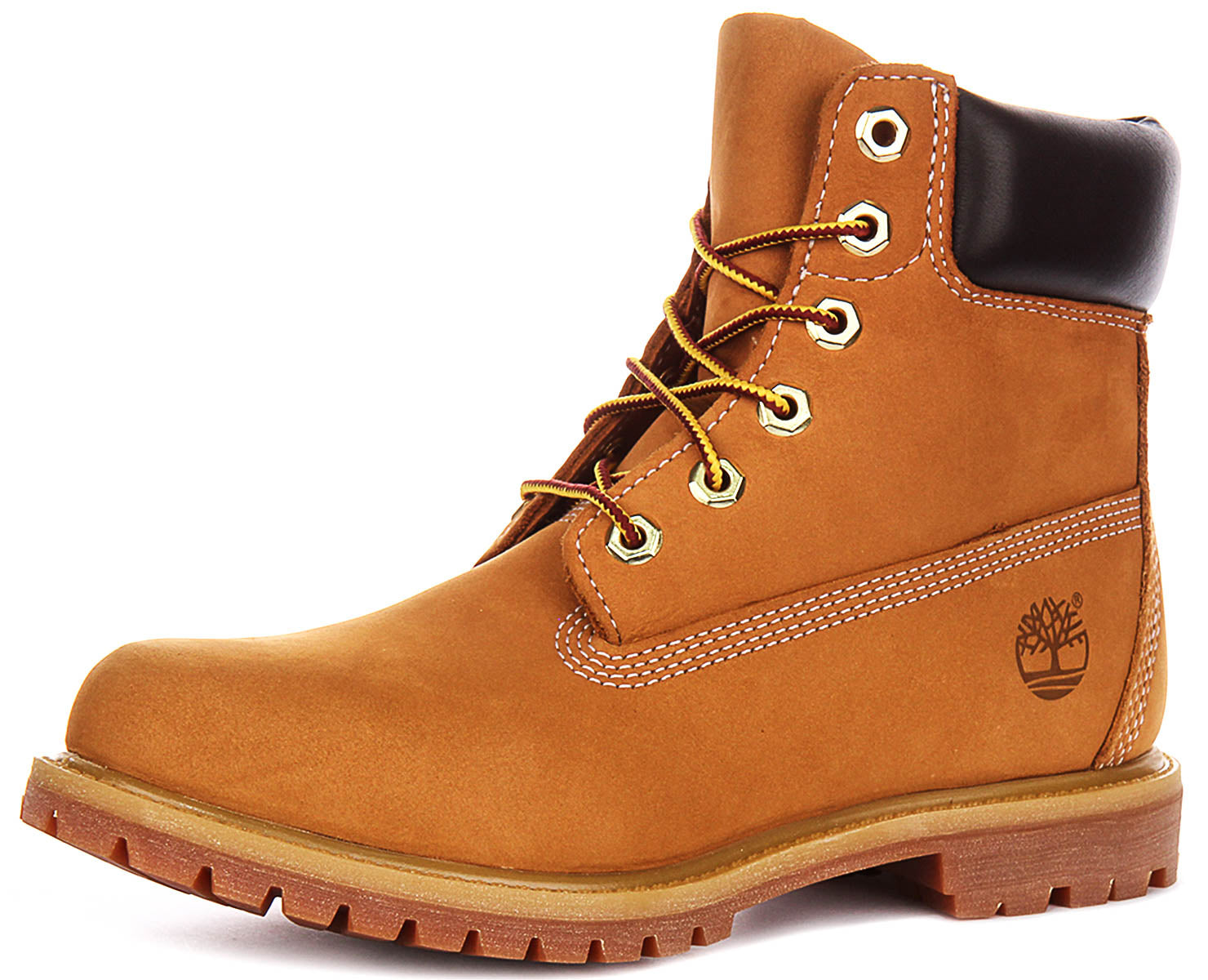 These exquisite boots feature a premium nubuck leather upper in a warm, wheat-inspired hue, known for its soft touch and robust nature. The meticulous craftsmanship is evident in the crisp white triple stitching that outlines the boot's durable construction, providing both strength and a distinctive visual flair. Comfort is paramount, thanks to the plush, dark brown padded leather collar that cradles the ankle, ensuring a snug and supportive fit. The sturdy lace-up design is completed with six pairs of polished gold-toned eyelets, complemented by eye-catching yellow and brown striped laces that add a touch of classic tithtmberland charm.