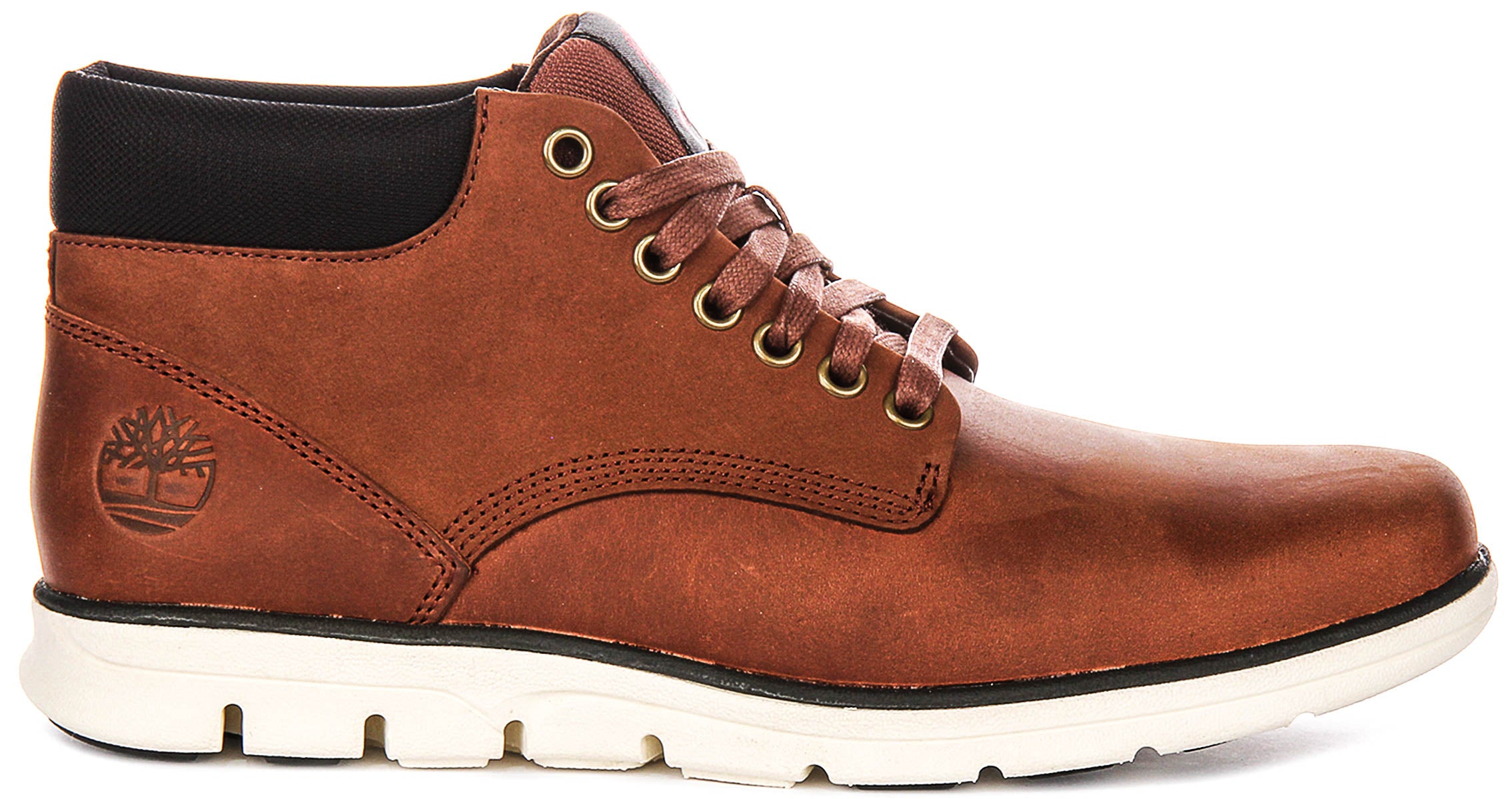 These distinctive ankle boots feature a rich, burnished brown leather upper, which gives them a rugged yet refined appearance. The durable leather is complemented by a classic lace-up fastening system with sturdy, metallic eyelets, ensuring a secure and adjustable fit. A subtle tithtmberland tree logo is embossed on the side of the boot, highlighting its authentic brand heritage, while the padded black fabric collar provides extra comfort around the ankle.